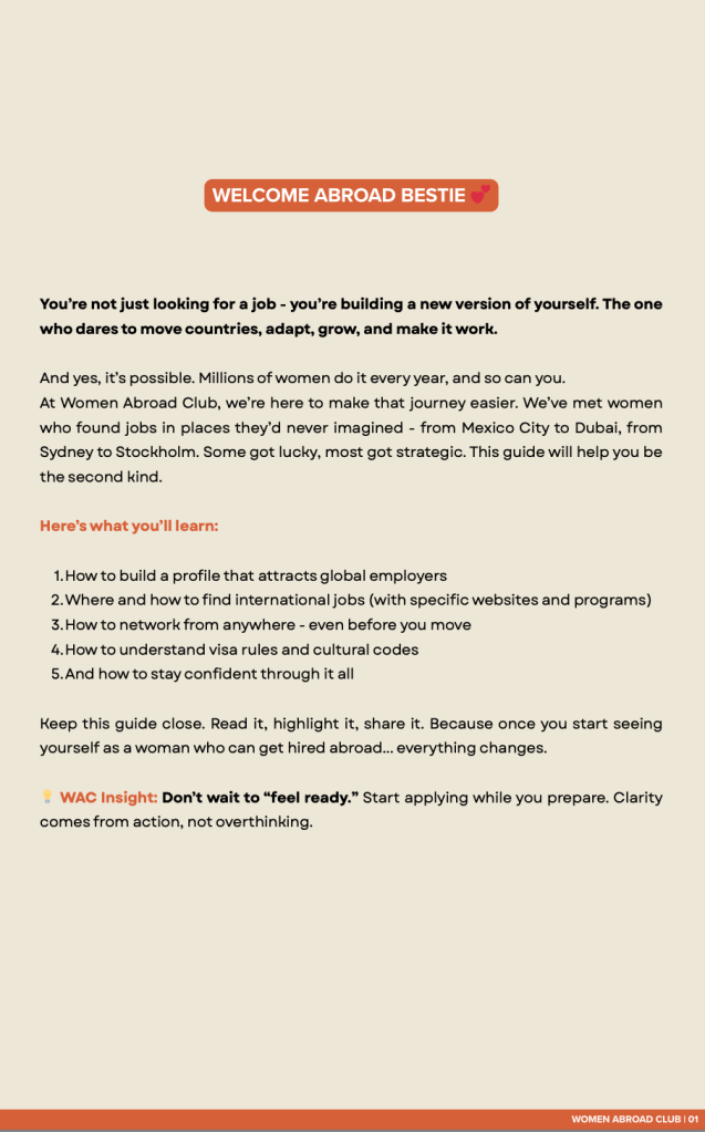 At Women Abroad Club, we are working on forming a global ecosystem that helps women abroad not just adapt, but thrive. We have been building this digital hub for our members, which includes e-books, journals, templates, and many other great tools to help you live your best life abroad. To access the digital hub, become a member today for free by filling out a short form – it’ll only take you 20 seconds! After that, we will directly send you the link to our resources page.